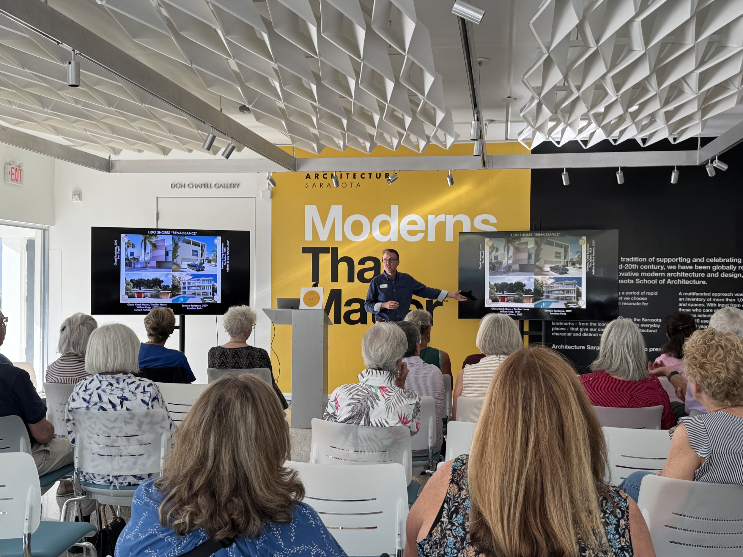 (Above) Architectural Scholar, Christopher Wilson, presented the 100 Moderns That Matter at Architecture Sarasota with a slide showing our 2010 SOLSTICE-design, The Serrano Residence (The Piano House), on Lido Shores.