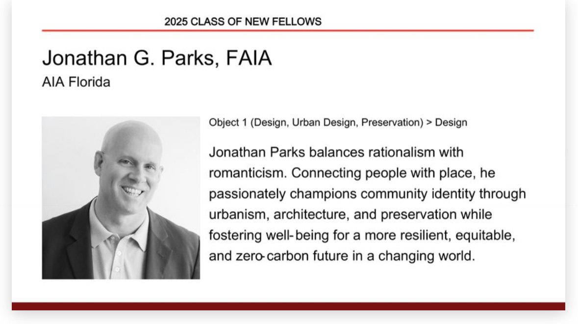 We are proud to share that Founder and Principal, Jonathan Parks, has been elevated to the American Institute of Architects (AIA) 2025 College of Fellows. This honor recognizes architects who have made significant contributions to the profession. Less than 3% of AIA members hold the prestigious FAIA designation.