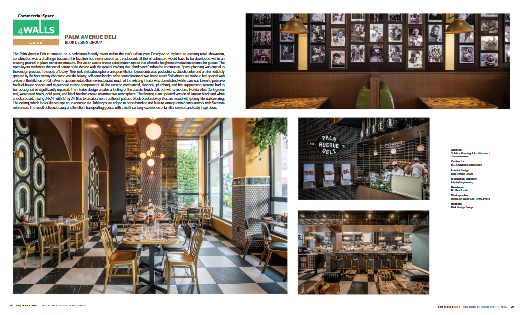 We were recognized, along with our friends at Blok Design, for our work on the Palm Avenue Deli by the SRQ Magazine 4 Walls competition (above).