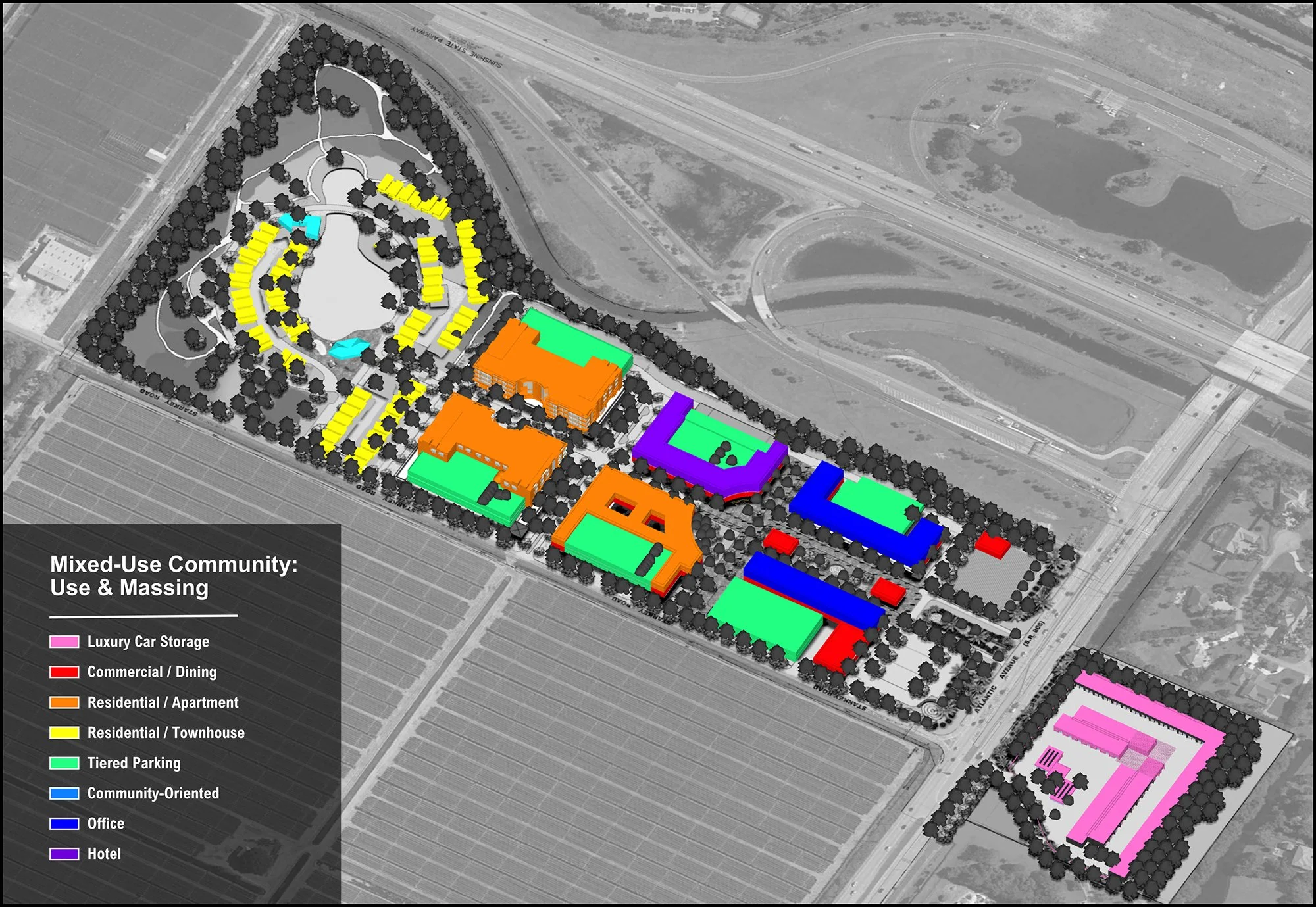 The south end offers car storage and a clubhouse with solar power. White roofs reduce heat absorption while the layout wraps the activity within.