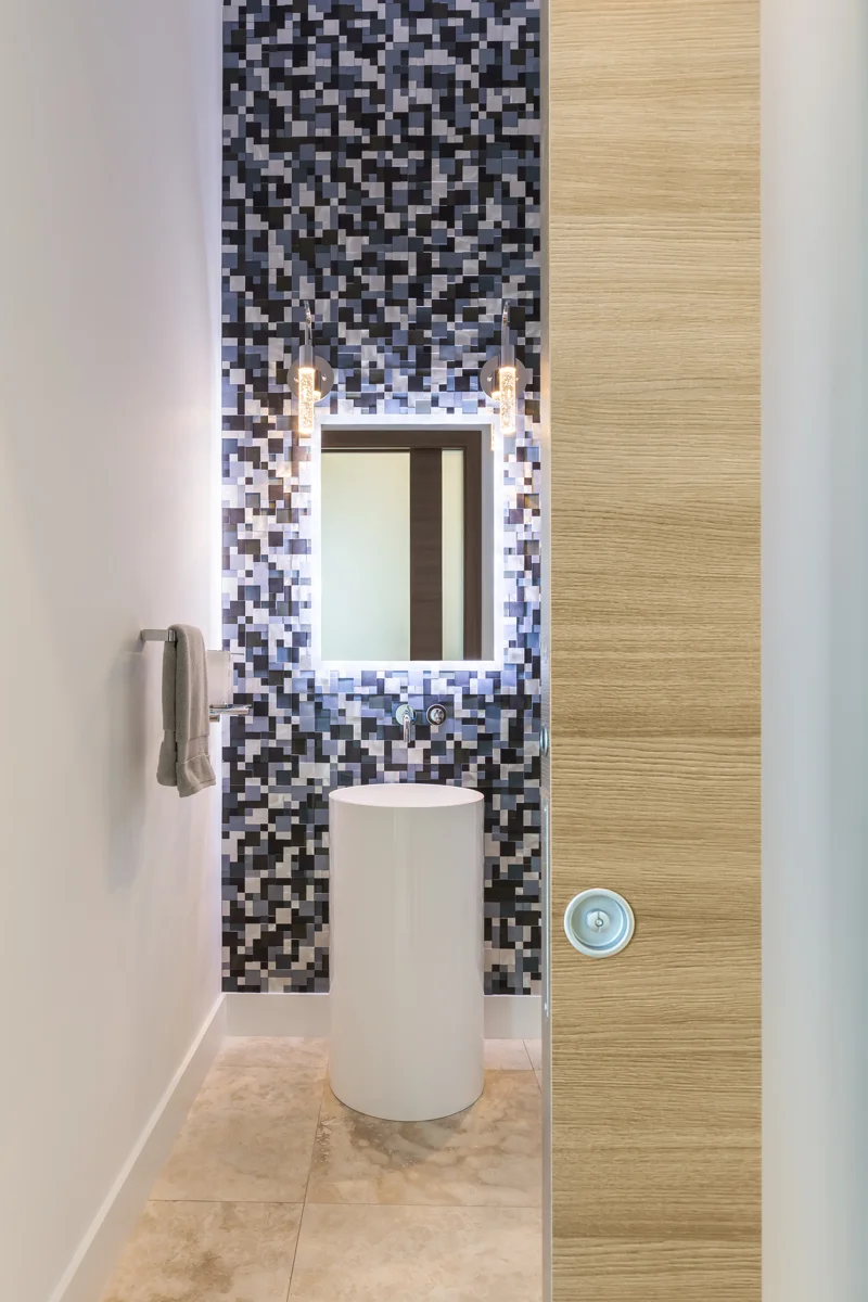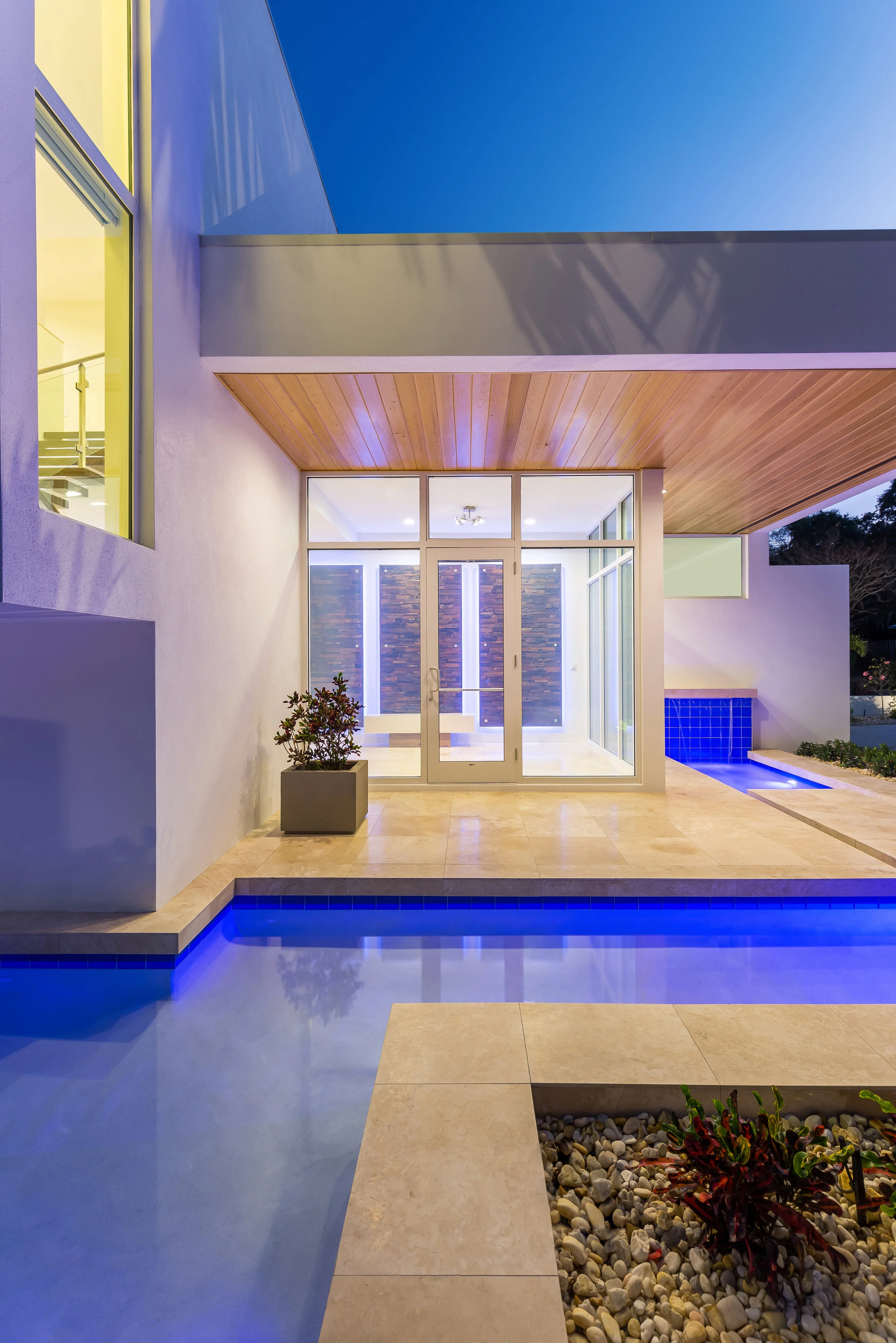 The sequence of arrival begins by crossing the stepping stones that lead over the entry pool and fountain. Once inside, the main living areas unfold without ever losing a connection to the water. Walls and windows are purposefully oriented to provide privacy while opening up to the surrounding nature. Sliding glass doors, vistas down long corridors, and transom windows grant natural light throughout the course of the day.