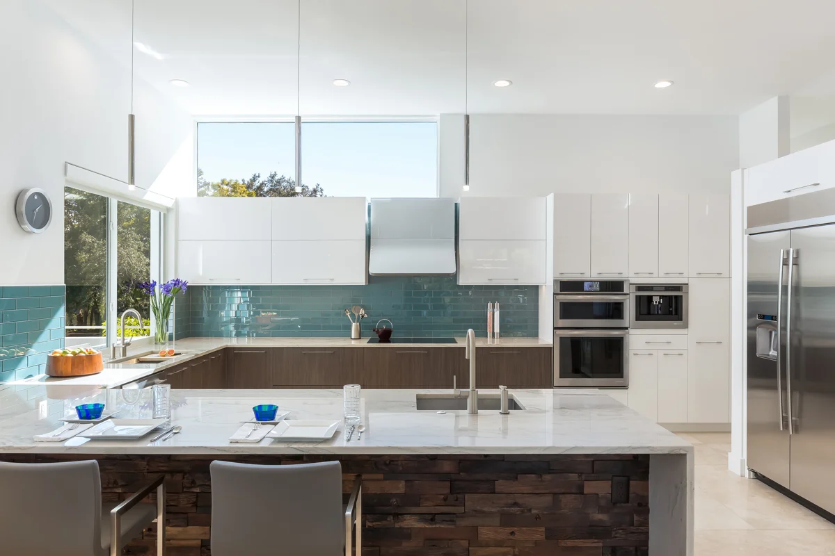 The centrally located kitchen which opens to the dining and living room, features natural quartzite countertops and a glass-tile backsplash that continues the unembellished aesthetic. A distinctive modern stairway of solid cedar steps orchestrates the daily journey from public to private spaces upstairs while a playful landing overlooks the pool. To create natural cross ventilation, sliding glass doors disappear within the walls to create an unobstructed view towards the pool terrace on one side and an outdoor deck on the other. The living experience extends to the outdoors where wide overhangs and existing Mesic Hammock trees provide protection from the elements.
